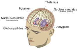 - basale ganglia (putamen, globus allidus en nucleus caudatus) = controle motoriek