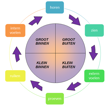 Waar je je aandacht op richt is een keuze tussen iets kleins of groots (ook wel smal of breed genoemd) en tussen iets wat binnen in je is of buiten je ligt (ook wel intern of extern genoemd).